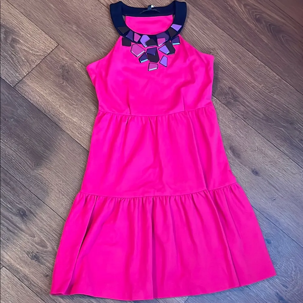 This stunning pink sundress by Cynthia Steffe is perfect for a cocktail night out. It features a sleeveless design with a halter neckline and a beautifully tiered, embellished skirt that adds a touch of elegance. The lightweight fabric ensures comfort and graceful movement, making it a delightful choice for any casual occasion.