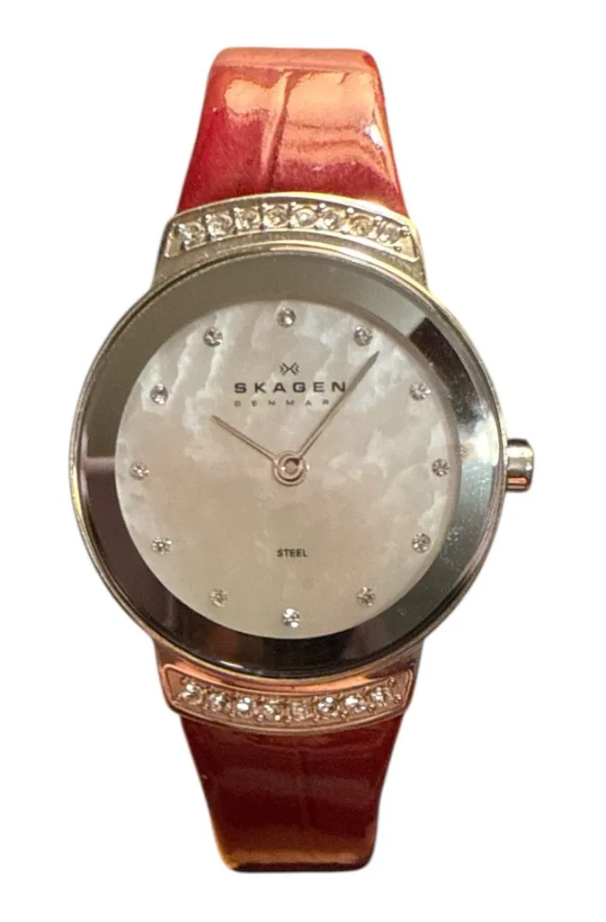 Elegant Skagen women’s wristwatch featuring a beautiful mother-of-pearl dial with crystal hour markers and a genuine leather strap in a deep red/cognac tone. • Strap length: Approx. 8 inches + clasp • Case material: Steel (marked on dial) • Dial: Mother of pearl with crystal accents • Strap: Genuine leather • Condition: Pre-owned, good cosmetic condition with normal light wear • ⚠️ Needs a new battery (not currently running) A classic, minimalist Scandinavian design that dresses up or down easily. Perfect for everyday wear or gifting once the battery is replaced. Skagen watch, women’s watch, Danish design, minimalist watch, mother of pearl dial, crystal markers, leather strap watch, classic watch, quartz watch, needs battery