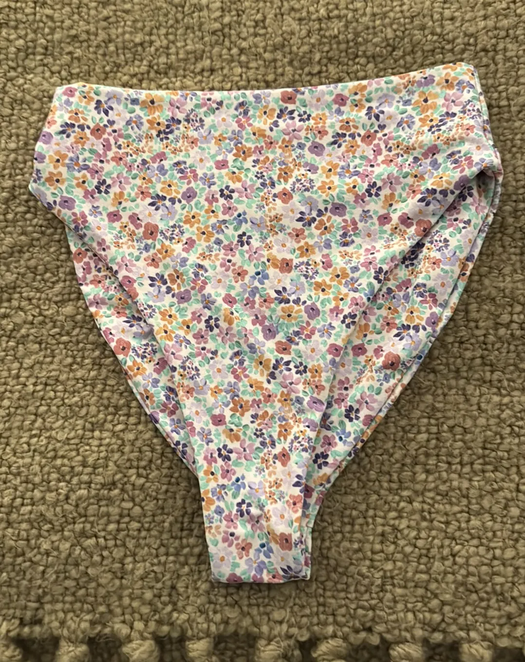 High waist, high leg, moderate coverage bikini bottom Hygienic bikini liner still in place