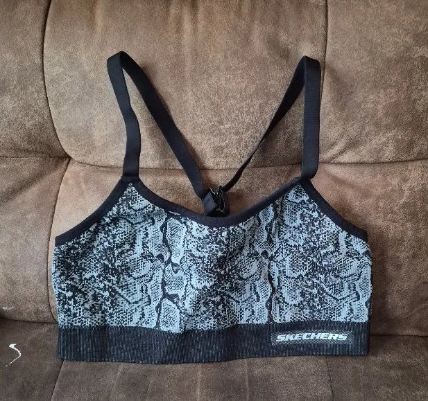 Experience comfort and style with the Skechers black and gray reptile print sports bra. Perfect for... Show more