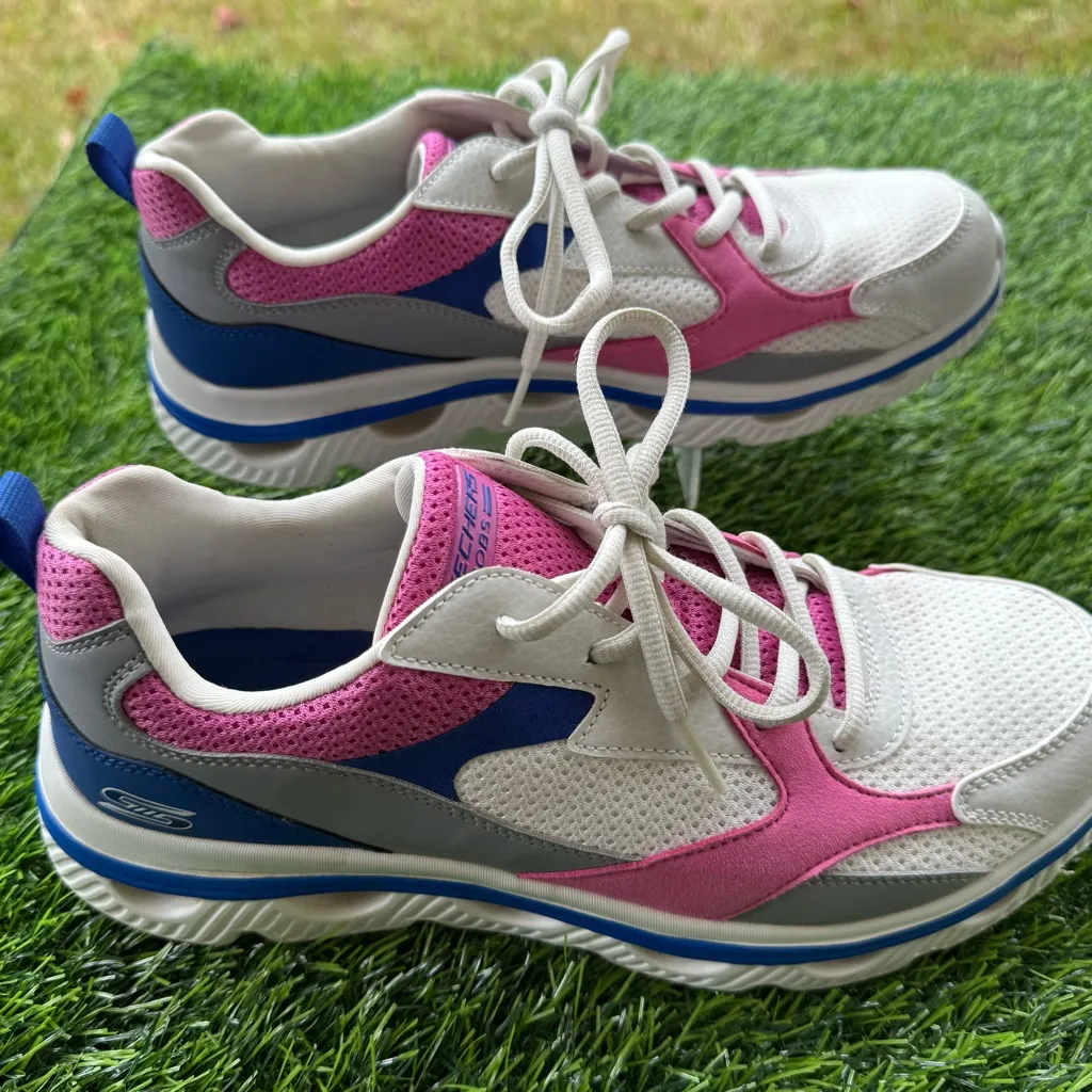 Sleek Skechers sneakers with a white base. Accented with pink and blue details. Perfect for active w... Show more