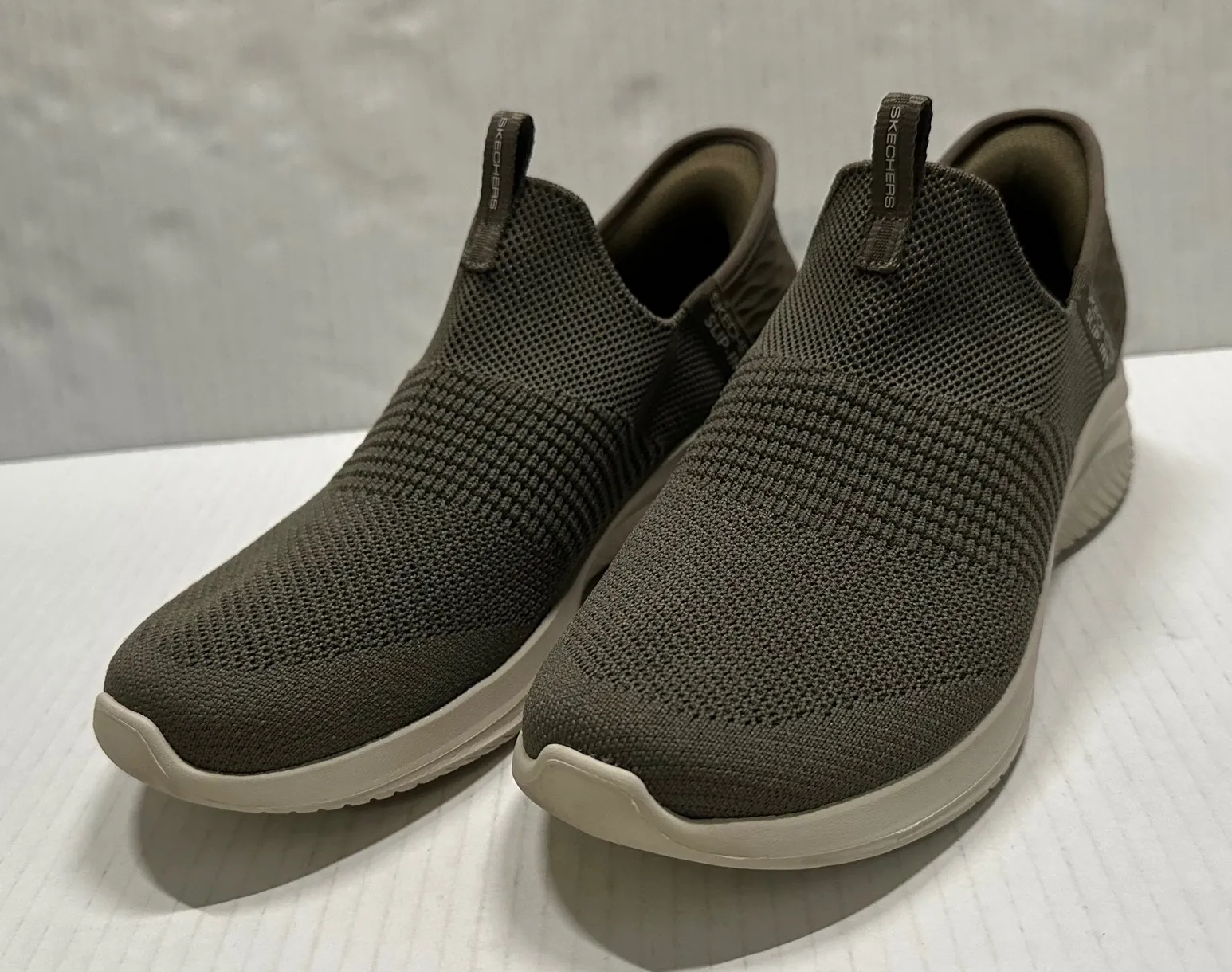Keywords: skechers, slip on, womens sneakers, olive green, athletic shoes, casual, comfort, knit upper, slip ins, ultra go, hands free, walking shoes, everyday