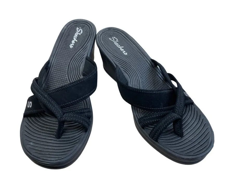 These Skechers wedge sandals offer a blend of style and comfort with a slip-on design, 2.5-inch heel... Show more