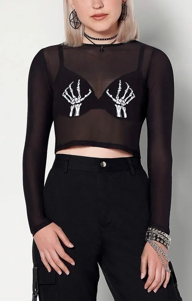 Smoke free home Preowned GUC No visible rips stains or cracking Skeleton Black Mesh Crop Top Size Sm... Show more