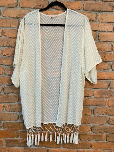 Elevate your summer wardrobe with this stunning Skies Are Blue kimono cardigan. Featuring a chic chevron pattern in a soft white hue, this versatile piece is perfect for beach days, festivals, or casual outings. The lightweight, sheer fabric offers breezy comfort, while the fringe hem adds a bohemian touch. Open front design allows for easy layering. Ideal as a swimsuit cover-up or paired with jeans and a tank for a stylish everyday look. Made from 100% polyester for easy care. Keywords: chevron, cardigan, beach cover up, sheer, lightweight, summer, festival, layering, open front, swimsuit cover Very good condition, no flaws. Measurements are approximate. Pit-to-pit: 21.5" Length: 36"