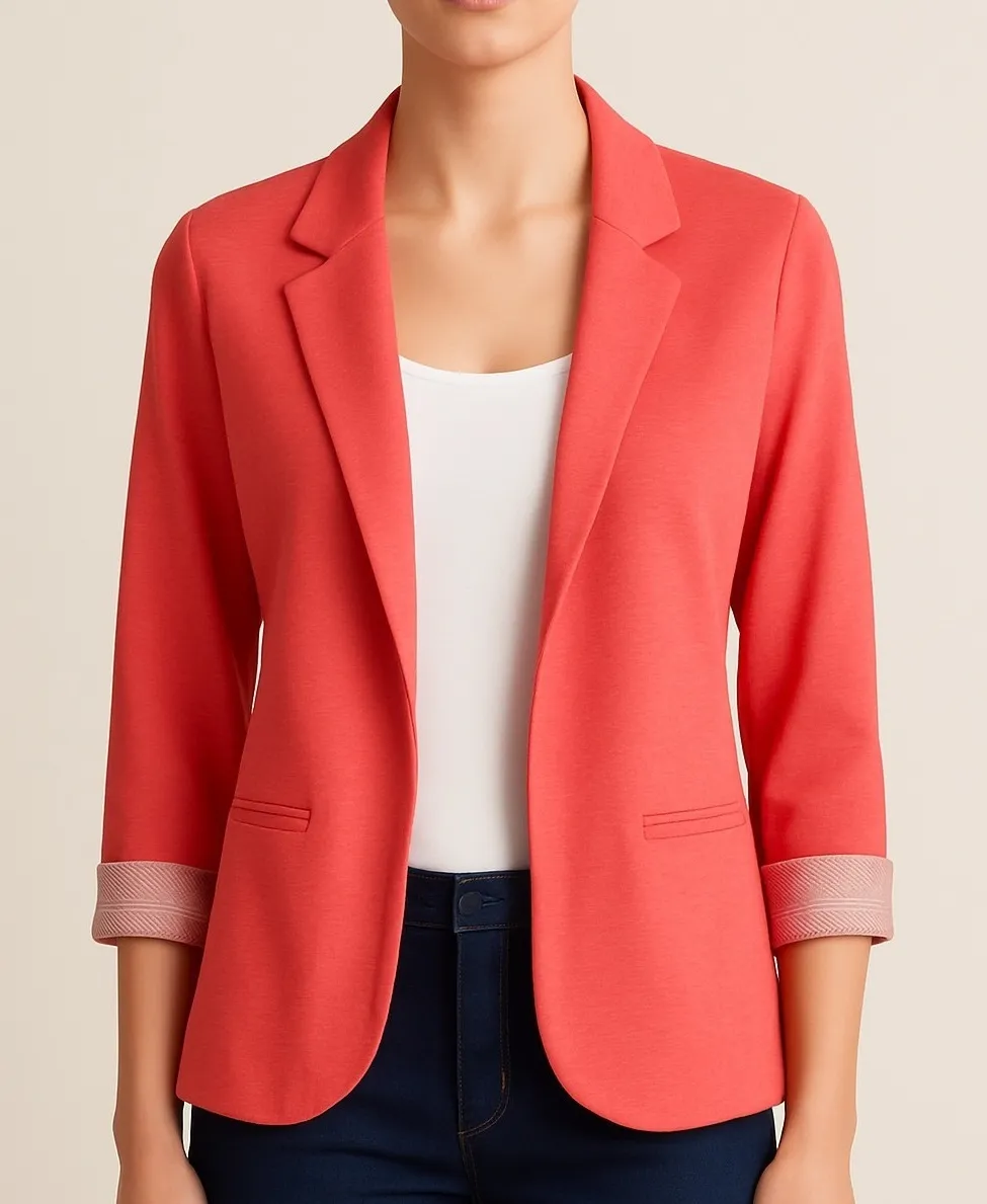 Coral pink blazer with roll tab sleeves. Classic lapel design and two front pockets. Perfect for layering over tops for a polished look. Ideal for business casual settings or a chic evening out. Type: Blazer Style: Basic Jacket Department: Women Features: Collared, Pockets, Unlined Fabric Type: Knit Pattern: Solid Season: Spring, Summer Occasion: Casual, Workwear Sleeve Length: 3/4 Sleeve Fit: Classic Keywords: blazer, coral, pink, womenswear, lightweight, casual, business, tailored, spring, summer, outerlayer, smartcasual, workwear