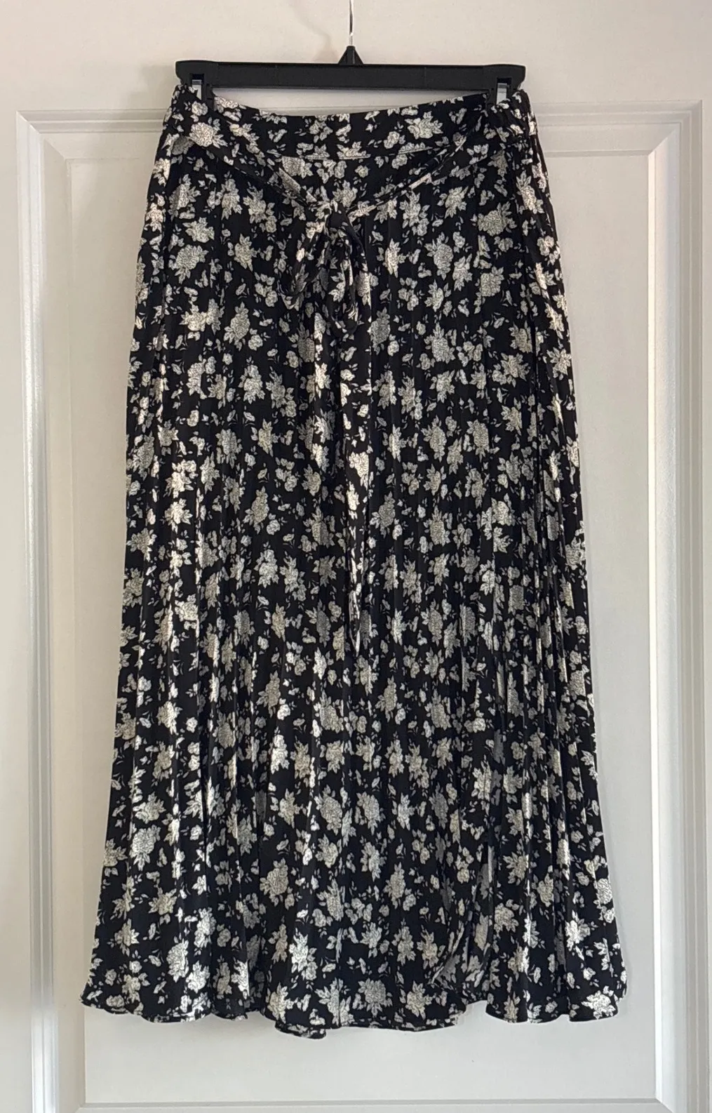 Skies Are Blue Pleated Midi Skirt in black with a delicate white floral print. This skirt features a flattering pleated design throughout and a subtle slit for ease of movement. Elastic waist (pull on) and front tie detail. No pockets. No lining. Front slit (left leg) goes half way up skirt. Waist 16" Length 31" New With Tags Fast Shipping! 1-2 Business Days We love accepting offers :)
