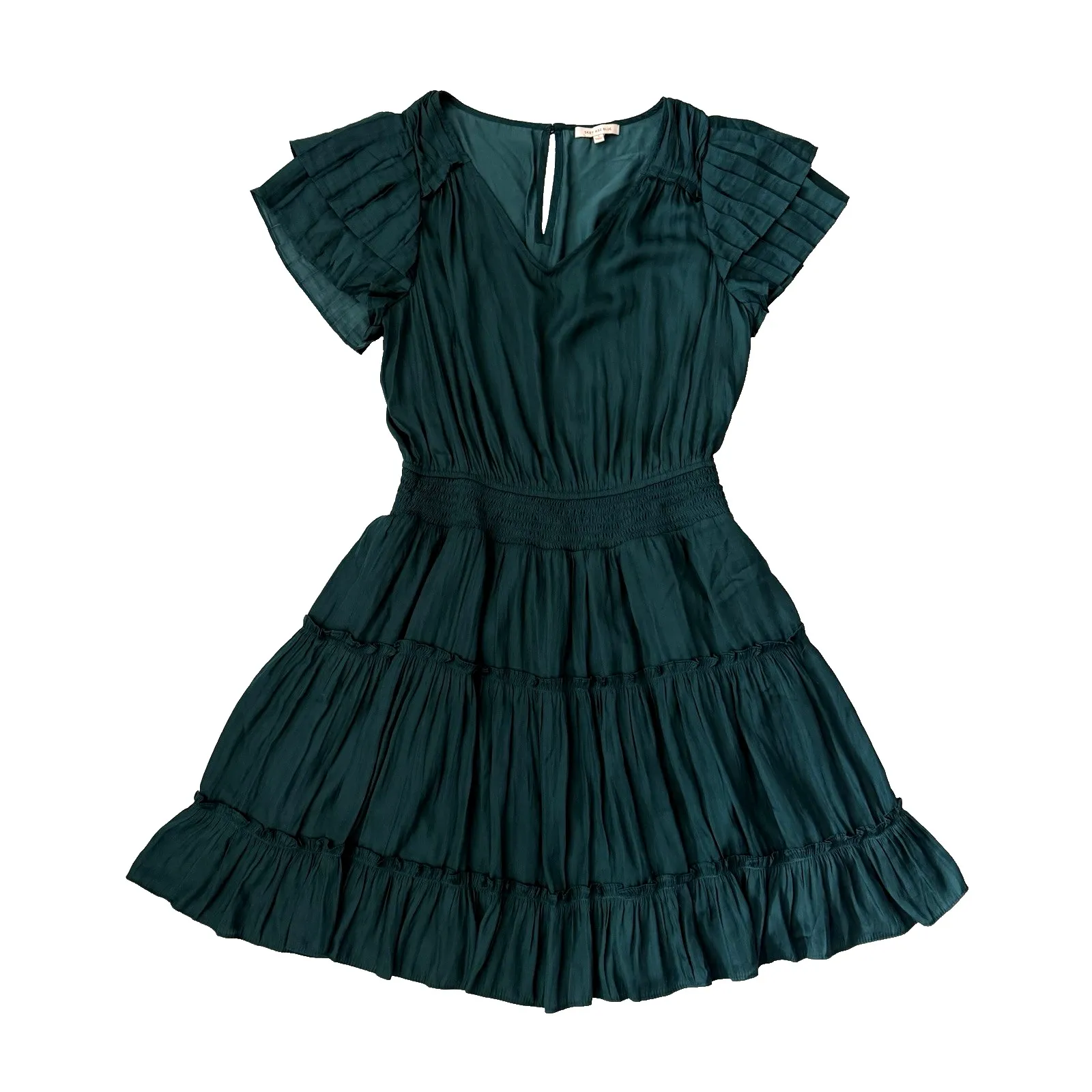 Keyhole Back Elastic Waist Condition - pre-owned - no stains, holes, or issues noted. Please see all photos as they are part of the description. Brand: Skies are Blue Style: V Neck Tiered Party Dress Women's Size: Small / 4 -6 Color: Green Pull On Styling with Keyhole Back Button Closure V Neck Elastic Waist Lined Skirt Portion Tiered Peasant Short. Flutter, Knife Pleat Sleeves Polyester (Dress) / Polyester / Spandex (Lining) Made in China Machine Wash Style Profile: Party, Cocktail, Work, Date Night, Special Occasion Measurements - are in inches, approximate & taken flat, unless otherwise noted Underarm to Underarm - 41" doubled At Waist Seam - 28" - 34" doubled (flat to stretched) Dress Length - 37" 12 oz