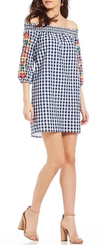 ✨ Skies Are Blue Smocked Off the Shoulder Floral Embroidered Gingham Shift Dress FromSkies Are Blue, this dress features: Shift silhouette Off the shoulder neckline 3/4 sleeves Smocked shoulder Floral embroidery Gingham print Pullover construction Polyester/cotton Hand wash Imported.✨