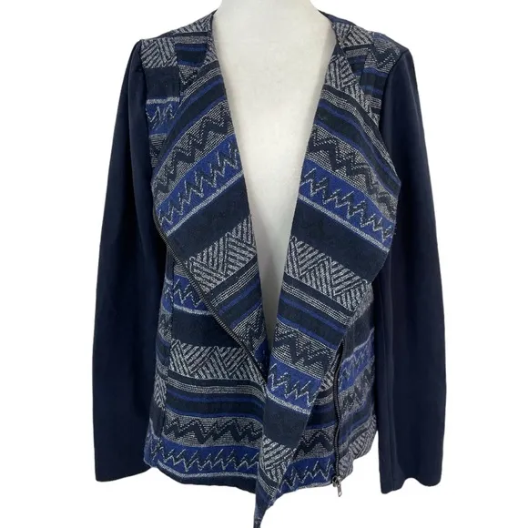 Skies are Blue moto jacket. Thicker woven body. Geometric striped pattern in shades of blue and white. Offset zipper closure on the front. Draped design when worn unzipped. Solid navy blue long sleeves made from a lighter weight soft faux suede fabric. Unlined. Self material: 100% cotton. Contrast material: 100% polyester. Brand: Skies Are Blue Style: 20666 Size: M medium Color: Navy Multi Condition: Pre-owned. Fair condition. Some pilling all over from regular wear, especially at the shoulders and along the sides. See pictures. Approximate measurements laying flat: Pit to pit 19.5" Length 22.5" (when zipped) Style: Biker Jacket, Light Jackets, Geo, Asymmetric, Asymmetric, Layering Piece, Fall, Autumn, Mixed Materials