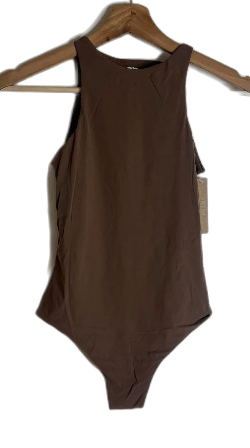 Brand: Skims Style: Fits Everybody High Neck Bodysuit one-piece with sleek tank silhouette and snap crotch closure. Color: Jasper (brown) in a solid, neutral tone. Size: Womens XS. Materials: 76% polyamide, 24% elastane (spandex) for a soft, stretchy, body-hugging fit. Style code: BX SB 1032. UPC: 197128053695. Details: High neckline, sleeveless cut, snap gusset closure, minimal-coverage back, smooth knit fabric ideal for layering and everyday wear. bag104 fall, cute , girly , lightweight , everyday , casual , neutral