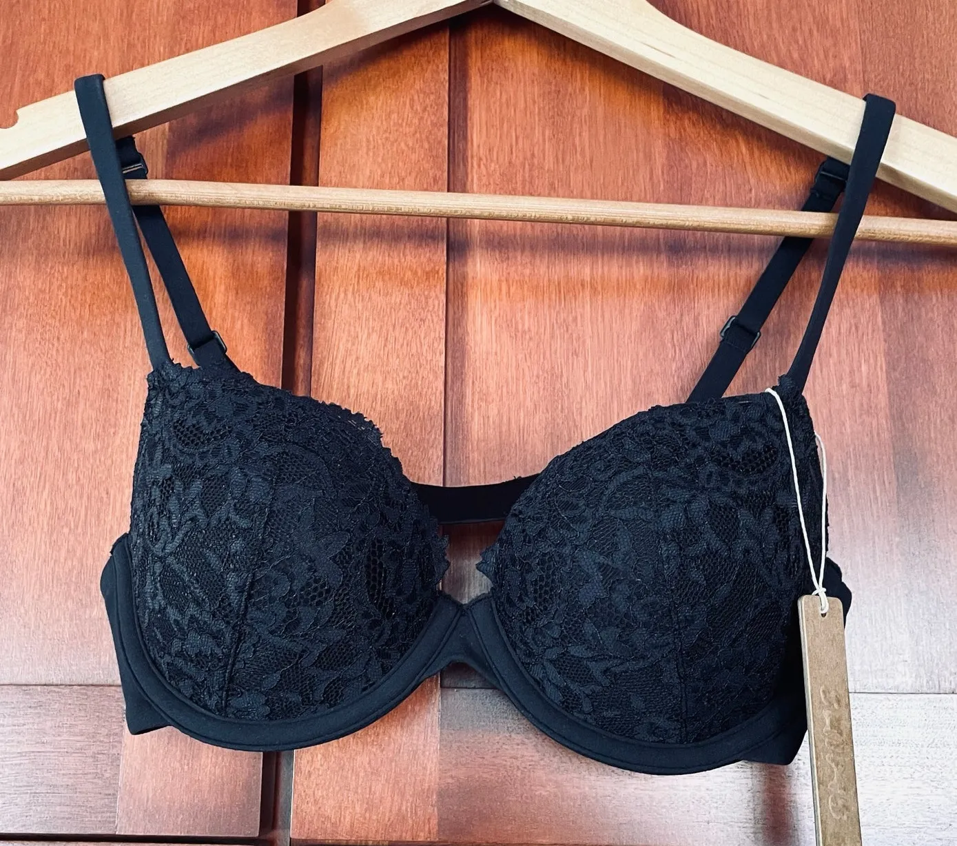 Black lace bra from Skims. Features underwires, push-up padded cups, adjustable straps, and a back hook and eye closure. Condition is new with tags Size 32B Polyamide, elastane