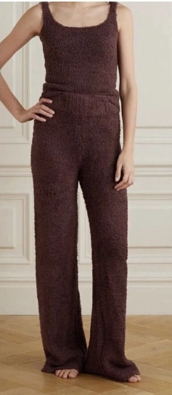 The Skims Brown Cozy Knit Wide Leg Lounge Pants in Garnet Bouclé are comfortable and stylish pants designed for a relaxing and casual occasion. Made from polyester knit fabric, these wide-leg lounge pants feature a pull-on closure and an elastic waist for a cute and cozy fit. The solid brown color adds a touch of sophistication to the overall look, making them perfect for travel or lounging at home. These sweatpants by Skims offer both comfort and stretch, making them a versatile addition to any woman's wardrobe.