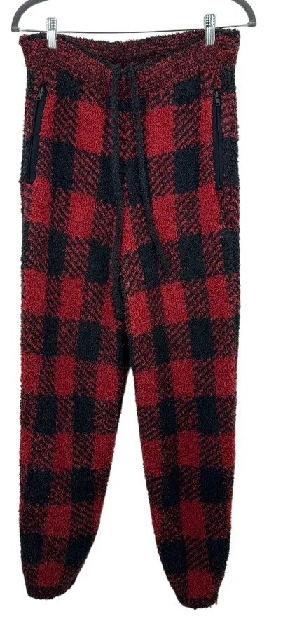 Pre-Owned in Good Condition Zipper Pockets, Drawstring Waist Approximate Measurements: Waist Flat Lay: 15" Rise: 16" Inseam: 28" Wrap yourself in ultimate comfort with these incredibly soft buffalo plaid fleece joggers. The plush sherpa-like texture invites you to relax and unwind, while the classic red and black buffalo check pattern adds a touch of rustic charm. Designed for both style and function, these pants feature convenient zippered pockets to keep your essentials secure and a drawstring waist for a personalized fit. Perfect for cozy nights in, casual weekend outings, or even as stylish loungewear for a cabin getaway.