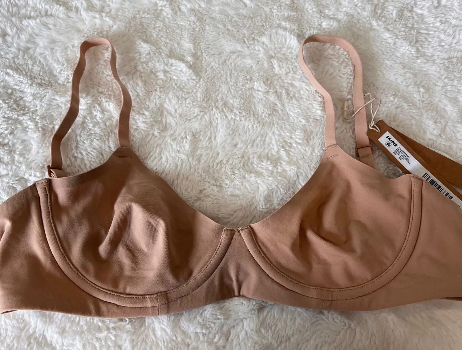 SKIMS Fits Everybody Unlined Demi Bra in the color Clay. This essential undergarment offers a smooth and seamless look under any outfit. Designed for everyday comfort and support, it's perfect for work or a casual outing. Type: Bra Style: Bralette Department: Women Band Size: 34 Cup Size: B Features: Adjustable Strap, Lined Underwire Type: Underwired Pattern: Solid Fabric Type: Microfiber Accents: Strap Strap Type: Normal Strap Material: Polyamide Blend, Spandex Blend Opacity: Semi-Opaque Closure: Hook & Eye Garment Care: Hand Wash Only Keywords: Skims bra, Demi bra, Unlined bra, Everyday bra, Comfort bra, Seamless bra, Wardrobe staple, Basic bra, Undergarment, Lingerie, 34B, Clay Ships 1-3 business days after purchase Comes from a pet free/ smoke free environment SKU:0047