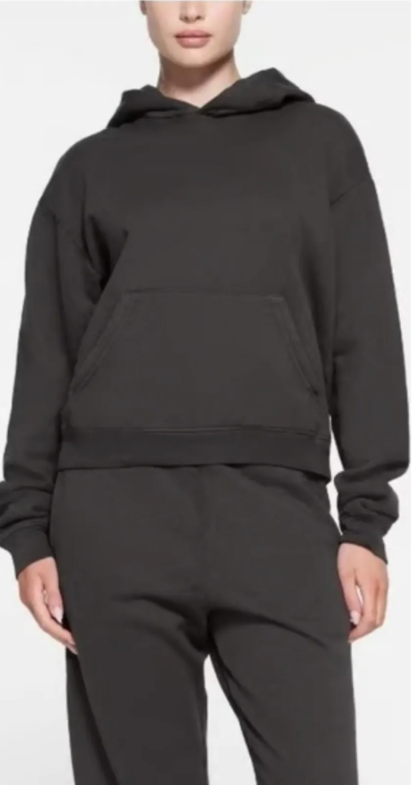 Skims French Terry Classic Hoodie in Ash Gray This classic hoodie has sporty raglan sleeves and a chic, kangaroo pocket, rib knit hem and cuffs and drop shoulders. Comfortable for heading out or hanging out. This everyday style is made with ultra lightweight and soft cotton blend terry for comfort. 74% modal 26% cotton Size Medium Armpit to armpit is approx 22" Length is approx 21"
