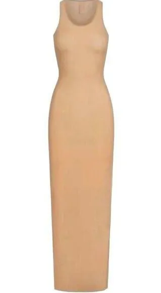 Introducing the Skims MESH COVER UPS LONG DRESS STYLE: CU-DRS-2843 in a beautiful OCHRE color. The dress is made of high-quality Nylon and Spandex materials, ensuring both comfort and durability. The sleeveless, crew neck design gives the dress a chic and stylish look, while the pullover closure makes it easy to wear. The dress is available in XL size and has a regular fit. The dress length is long, with a maxi and A-line style, making it perfect for any body type. Makes it a perfect cover up. Has a side slit opening on the left Size: XL COLOR: Ochre Length: 59”