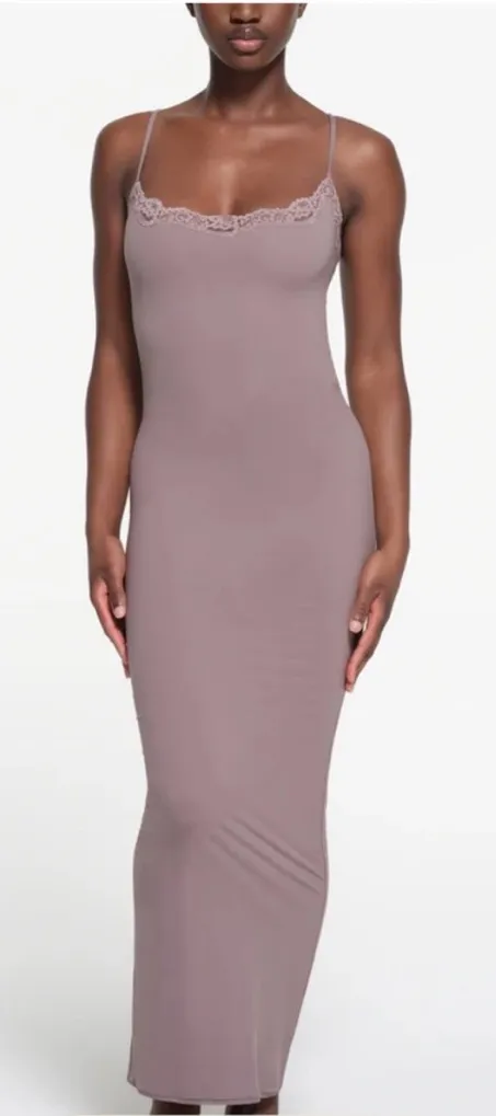 color New with tags 54” length Busy flat lay 18 1/2” Has plenty of stretch! Color is like a purple/ mauve Romantic stretchy lace details give this stunning slip dress the perfect femme touch. This buttery-soft, ultra-flattering maxi is double-lined with adjustable straps and a front scoop neckline. Fits true to size. Details: - Scoop front neckline - Adjustable straps - Stretchy lace trim along front and back neck and underarm CM20
