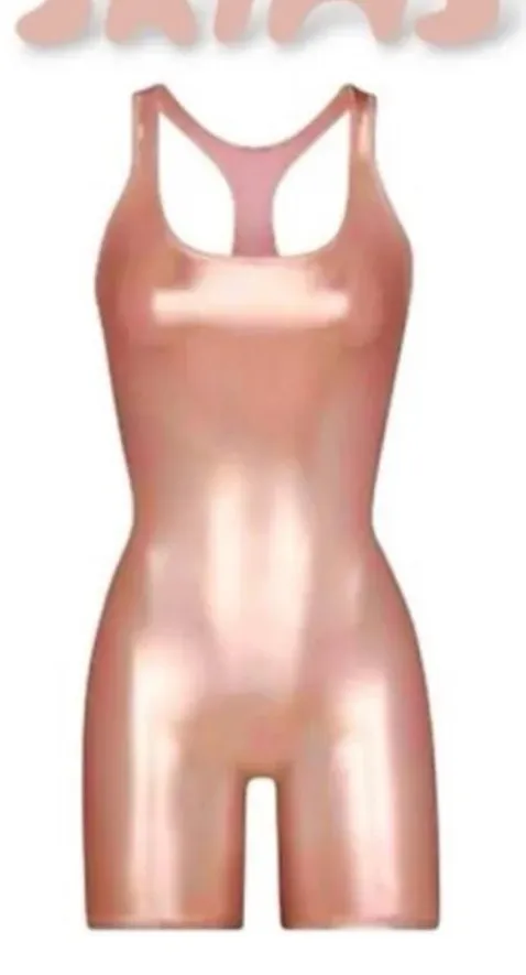 Brand new with tags / sold out online & wont be coming back! Swim approved cycle suit / gym approved / metallic Bodycon with stretch but will fit and form to the body. Keeping if not sold. Size: remember skims goes down to XXS so this is not the smallest size and does have stretch. Look up the skims cycle suit. Racerback Paid full price OG(this is for the color 1-3, final photo in gold is to show fit) this is a stunning Rosegold metallic “copper”