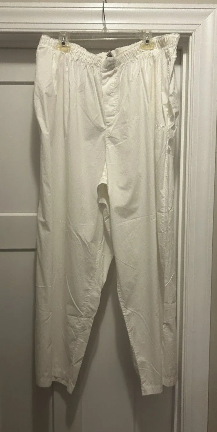 The SKIMS Pajama Pants in size 2X are cozy and stylish lounge pants perfect for sleeping or lounging. Made from 100% cotton poplin, these white pants feature an elastic waist for a comfortable fit. With convenient pockets and a logo accent, these pants are machine washable and suitable for all seasons. Designed for plus-size individuals, these unisex pants from the Skims brand offer a blend of comfort and style for a relaxing bedroom look.