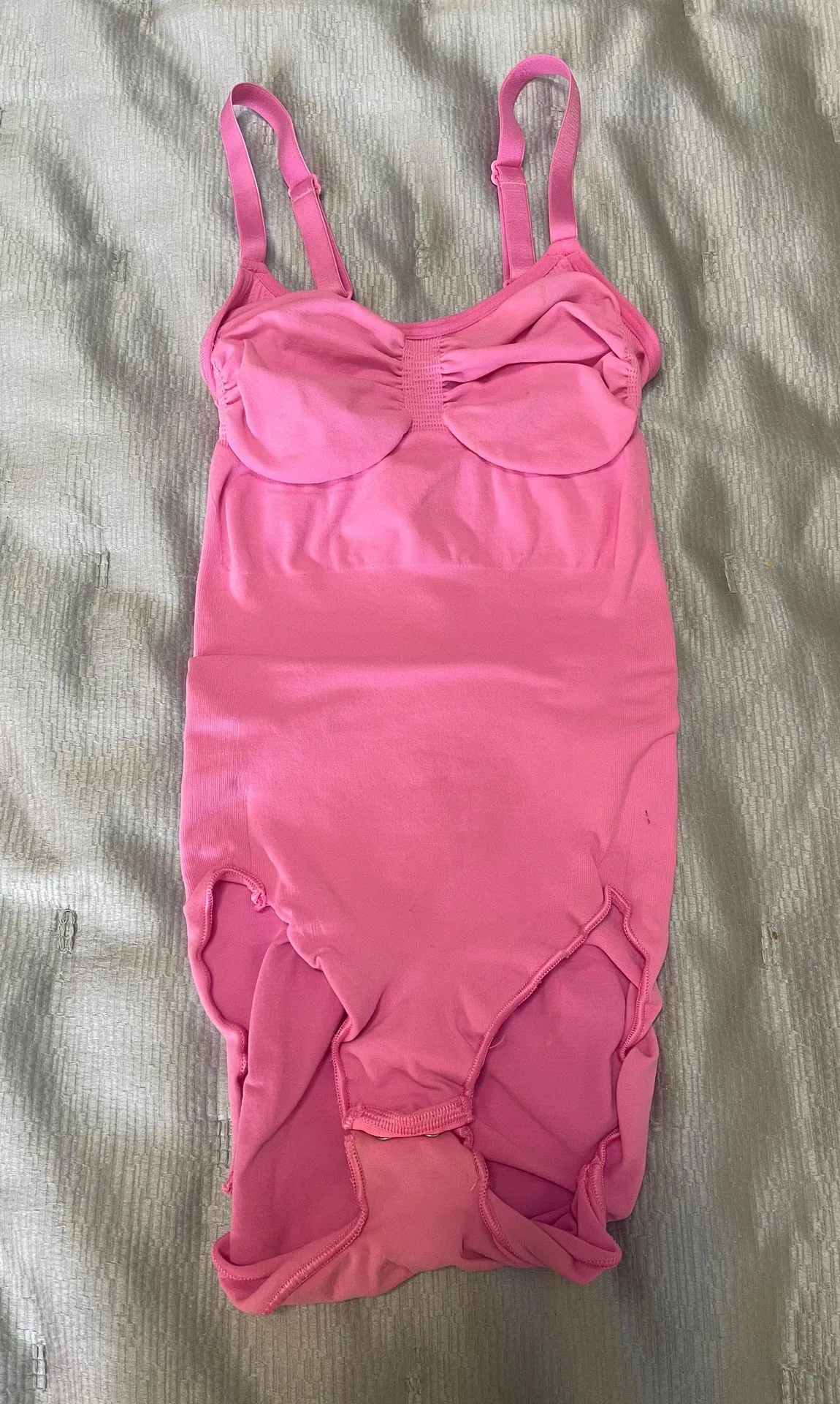 figure-enhancing style, extra compression at the core and waist, perfectly placed style lines that flatter your bust, and rounded butt pockets for a lifted look. Features adjustable straps, a wide crotch for added coverage, and a cotton gusset with snap closure. Fits true to size. Super cute in pink.