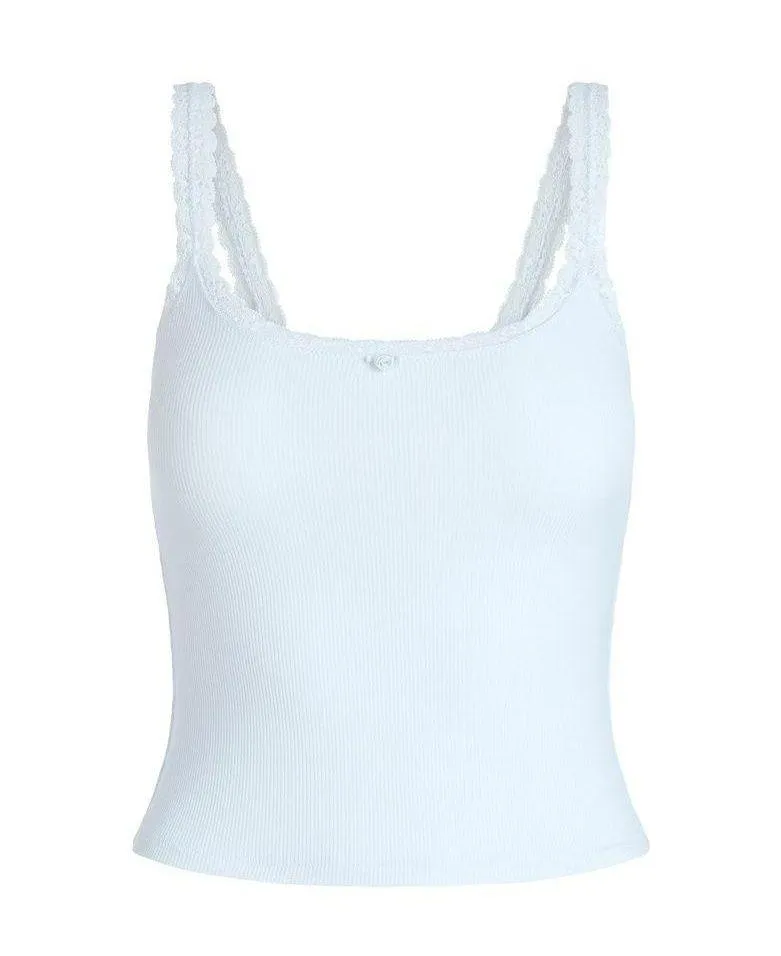 Description: Sweet on Soft Lounge Lace. Perfected with feminine lace trim at the neckline, armhole, and waist, this cami set is made with our ultra-soft, ribbed modal fabric you know and love. Includes a scoop neck tank with rosette center details at the front. Details: Color: Blue Quartz Scoop Neck Tank Lace Trim At Neckline, Armhole And Waist Rosette At Center Front And Waist 91% Modal / 9% Elastane Scoop neck Machine wash, dry flat Imported