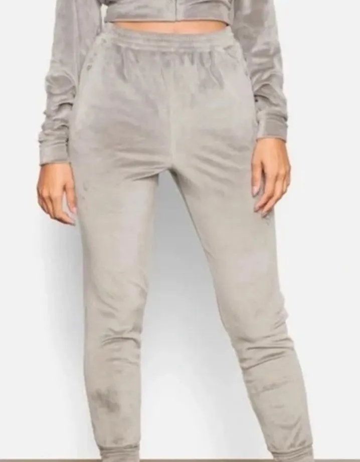 SKIMS Velour Gray Jogger Track Pants Loungewear Velvet Cozy Size Medium Great condition. No rips, stains or flaws. Gently worn. From Skims: SKIMS' 'Velour' collection is a throwback to the early '00s. These track pants are made from the plush and stretchy material that the brand took its time searching for. This high-rise pair has a soft elasticated waistband and pockets to slip your phone and lip balm into. When heading out for coffee, take a cue from Kim Kardashian and Paris Hilton, who styled them with sneakers and oversized sunglasses.
