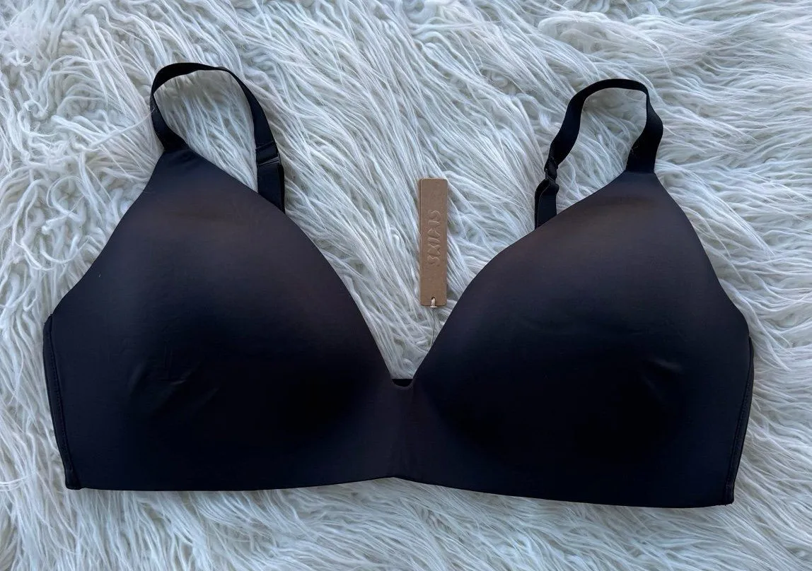 New Skims Wireless Form Lightly Lined Bra Onyx Size 46D A flattering plunge style with ultra-soft push-up foam pads that offer the perfect amount of lift and support. This wireless style has lightly lined, cloud-like foam pads for ultimate comfort and wide microfiber wings for a smooth and seamless look. Features fully adjustable straps, a tonal 3D SKIMS logo on the front, and a hook and eye back closure. Fits true to your SKIMS bra size. Flattering Plunge Neckline, Lightly Lined Molded Foam Pads, Wireless For Maximum Comfort, Fully Adjustable Straps, Wide Wing For Extra Smoothing, Tonal 3D Silicone Printed SKIMS Logo On Front Wing, Hook And Eye Back Closure Bundle to save S8