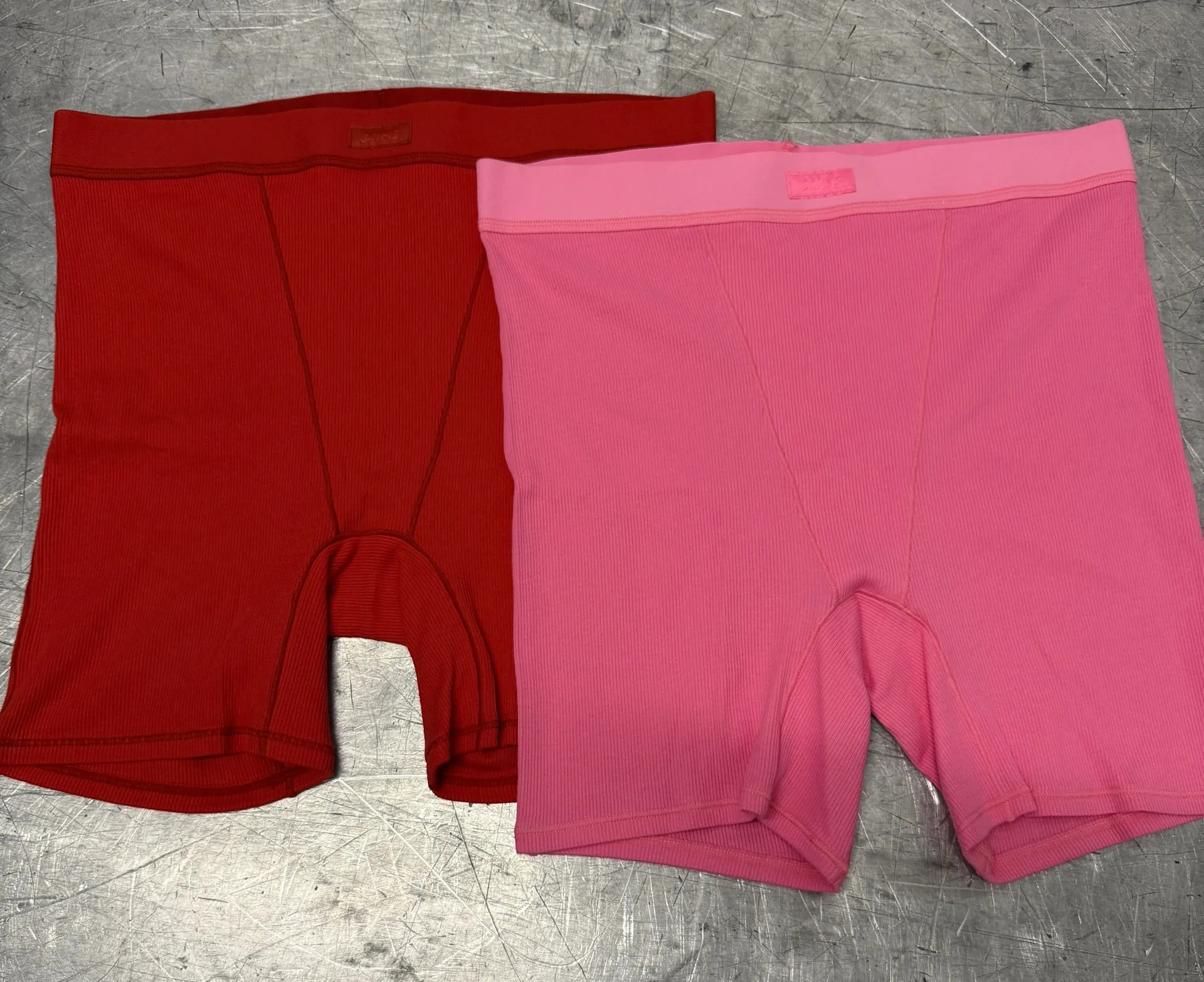 Women’s pair of cotton rib boxer shorts in pink and red. Soft, breathable and stretchy shorts with a sporty look and boyfriend inspired front stitching. Cotton blend, both in excellent condition, both size large
