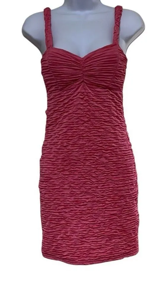 Skinwear Womens 10 Pink Ruched Bodycon Mini Dress Party, Cocktail Sexy Date Fully ruched Spaghetti straps Lightly padded cups, not removable Lined Bodycon 95% polyester 5% elastane Pit to pit: 13.5" Waist: 12.5" Hip: 14.5" Length: 33"