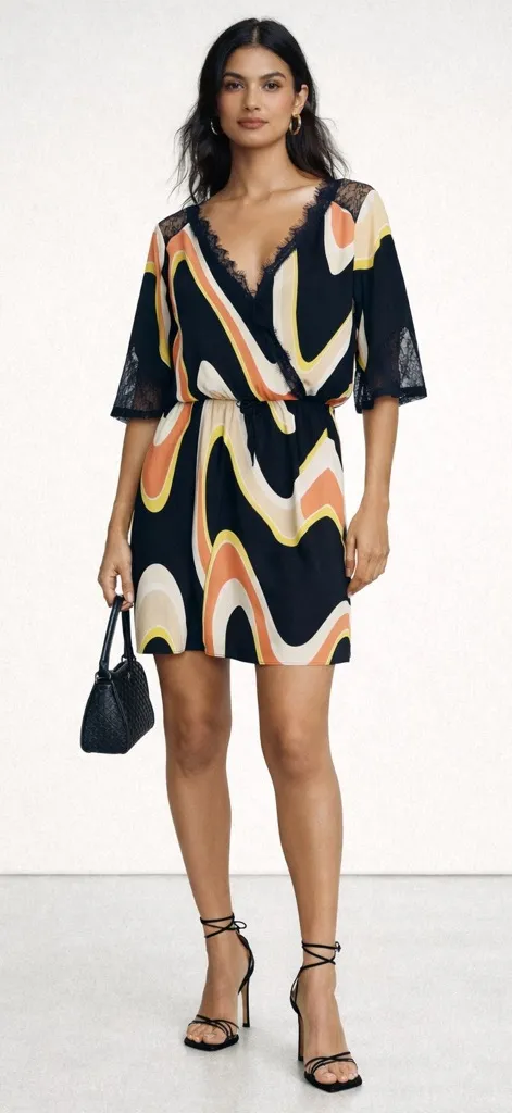 Skunkfunk silk mini dress in black with mod orange, yellow and white print. Sup lice v-neck with low back. Elasticized waist for a slight blouson look. Lace trim at sleeves neckline and shoulder. Size 44 equivalent to US size Large. Waist: ~16" Underarm to underarm: ~24" Center Back to hem: ~40"