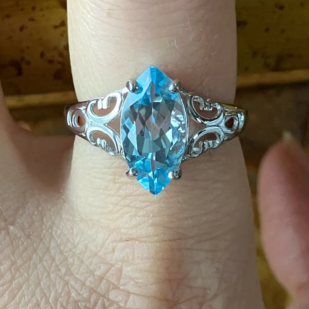 This classy ring features 3.50 ctw. of real, earth mined sky blue topaz. The marquise cut topaz measures 14x7mm. The ring is set in solid .925 sterling silver with a rhodium plate to prevent tarnishing. Size 8. Inventory: J12