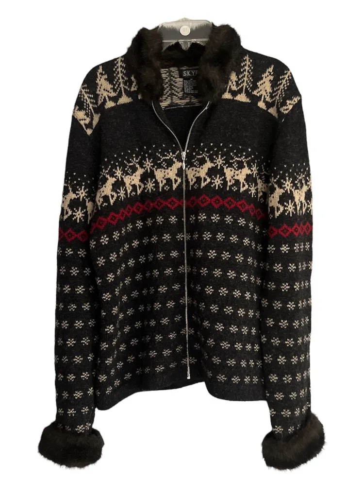 SKYR Nordic Fair Isle Faux Fur Collar/cuffs Wool Cardigan Sweater Med Women Elk. Beautiful 100% wool sweater trimmed in faux fur around neck and cuffs. Sweater has a metal zipper which may indicate it is vintage It is an excellent preowned condition with no holes or wear. “. EUC