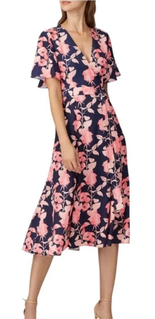 No flaws Pit to pit 16.5" Waist flat 14" Length 41" Style: Wrap Dress Dress Length: Midi Department: Women Sleeve Length: Short Sleeve Pattern: Floral Fabric Type: Rayon Theme: Rose Neckline: V-Neck Season: Spring, Summer Sleeve Type: Flutter Sleeve Closure: Tie Accents: Belted Features: Belted Unit Type: Unit Keywords: wrap dress, floral print, midi dress, navy dress, pink floral, v-neck, flutter sleeve, belted dress, feminine, charming, elegant, sophisticated, daytime, evening