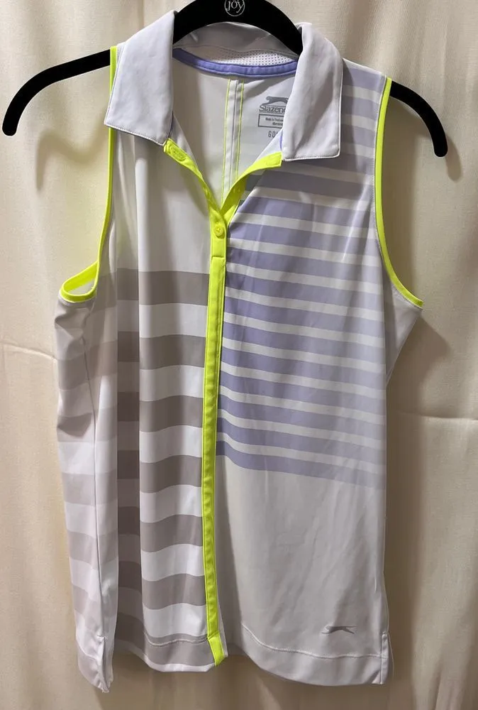 Elevate your athletic wardrobe with this stylish sleeveless tank top featuring eye-catching neon yellow accents and modern stripe detailing. Perfect for tennis matches, golf outings, or any active pursuit where comfort meets performance. The moisture-wicking fabric keeps you cool while the collared design adds a touch of sophistication. Pit to pit 18" Shoulder to hem 25" Keywords: athletic tank, tennis top, golf shirt, sleeveless, moisture wicking, performance wear, striped, neon yellow, white, collared, sportswear, athletic wear, activewear