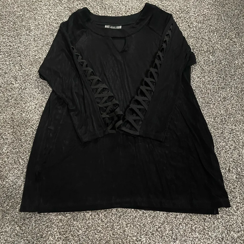 Slinky Brand Black Sleeves has a Crisscross open lattice cutout design 3/4 sleeve (approximately 17 1/4 in) Round neckline with a Keyhole cutout Blouse Top Shirt Large Body: 94% acetate, 6% spandex. Combo: 100% polyester Approximate length=28 in Approximate pit to pit=20 1/8 in Great condition BUT from my grandma’s house and likely will smell like her perfume Feel free to create a bundle or shoot me an offer! Smoke free, 1 dog home **might arrive wrinkly** This elegant black top features stylish lace-up details on the sleeves, perfect for any occasion. Its sleek design offers both comfort and sophistication.