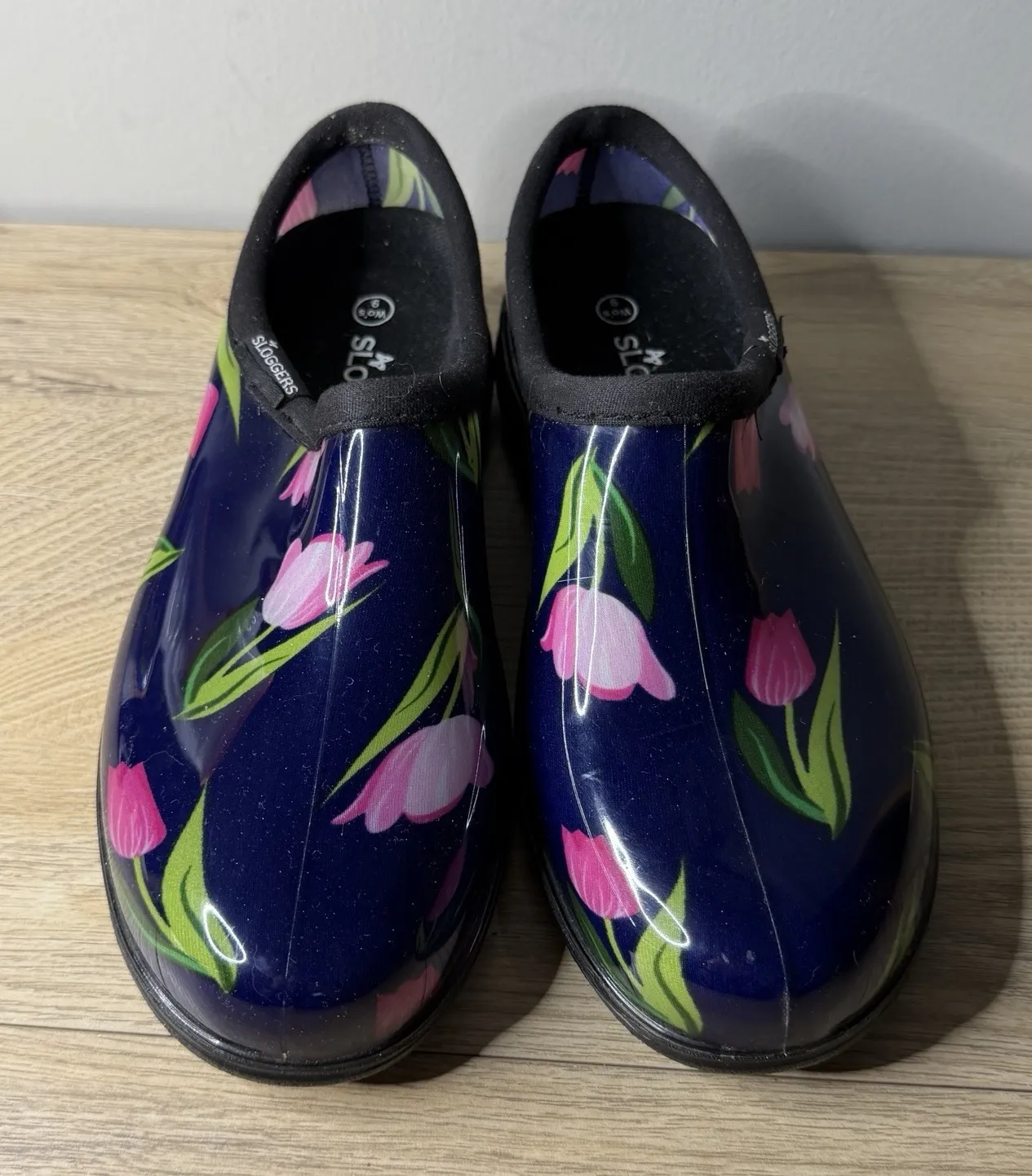 Cottagecore, garden girl, fairycore, botanical, floral print, country chic, farmcore, outdoor lifestyle, rain gear, mud shoes, comfort, waterproof, spring style, summer garden, utility, practical, tulip print, navy blue, colorful, hobbyist, homestead, yard work, quirky, kitschy, retro, whimsical, nature lover, gift for gardener, durable, easy clean Pre-owned in excellent condition unless otherwise stated. Please see photos for condition and details.