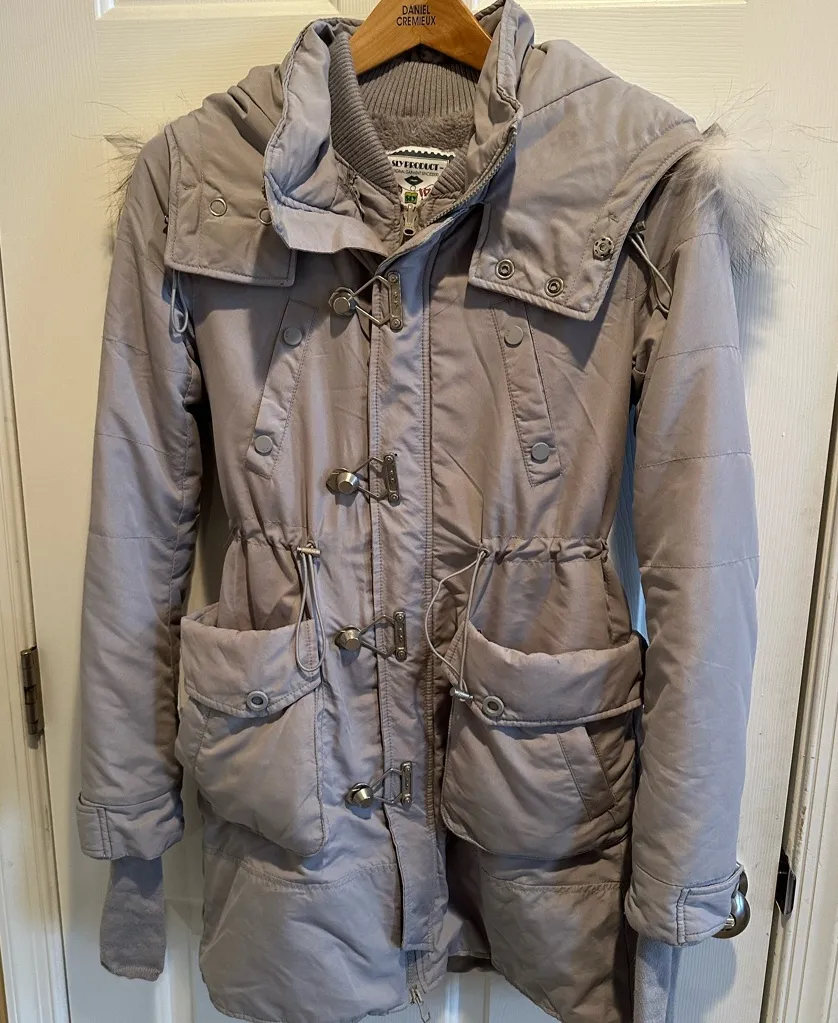 The SLY Military Buckle Steel Parka in Gray is a vintage Japanese women's jacket with a fur hood, ma... Show more