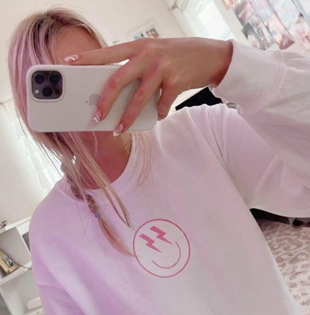 smiley face embroidered sweatshirt white crewneck , hot pink smiley face CUSTOM MADE BY ME oversized and comfy lightning bolt smiley face so cute and preppy #embroideredcrewneck #starfit #aviatornation #smiley