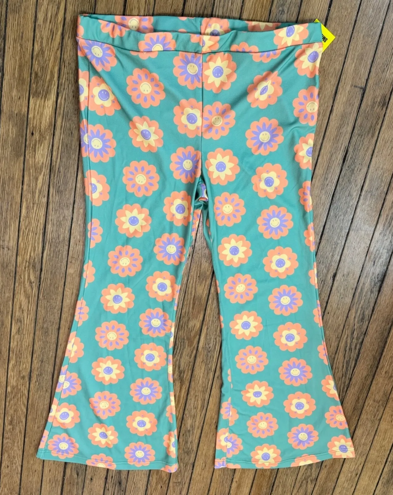 Groovy vibes abound with these Smiley World flare leggings! A playful daisy print in shades of orange, yellow, and purple dances across a refreshing mint green backdrop, creating a look that's both cheerful and stylish. The stretchy fabric ensures a comfortable and flattering fit, while the flared leg adds a touch of retro flair. These leggings are perfect for adding a pop of personality to your everyday wardrobe. Imagine yourself rocking these at a music festival, a casual brunch with friends, or even just lounging around the house in style. Color: Green Department: Women Type: Leggings Material: Polyester, Polyester Blend, Spandex Features: Stretch, Elastic Waist, Comfort, Lightweight Pattern: Floral Performance/Activity: Yoga, Loungewear, Walking, Dance Occasion: Casual, Party/Cocktail, Travel Inseam: 35 in Waist Size: 40 in Keywords: Smiley World leggings, flare leggings, daisy print pants, mint green leggings, plus size leggings, retro style pants, 70s fashion, boho leggings, stretchy leggings, yoga pants, loungewear, trendy pants, funky leggings, new with tags