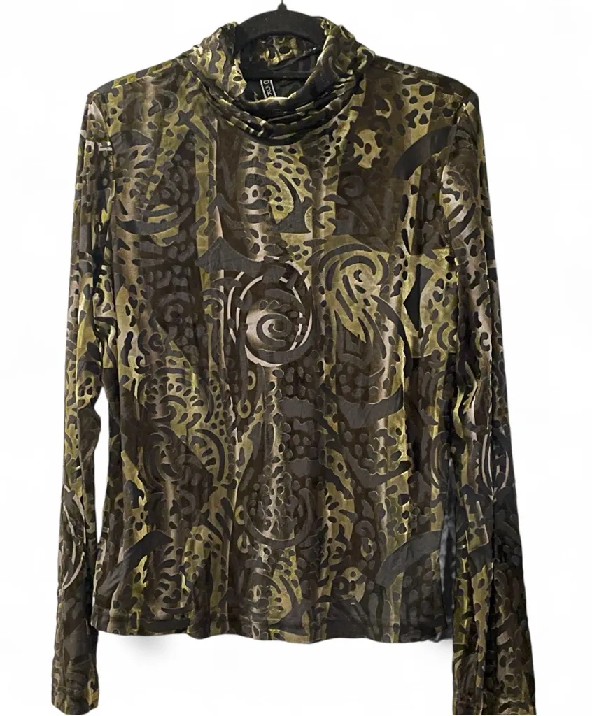 Statement burnout velvet top by Sno Skins. ✨ Abstract animal-inspired pattern in olive green & black ✨ Stretchy semi-sheer fabric with a soft shimmer ✨ Turtleneck silhouette | Made in USA | Size Large Excellent condition — a standout piece for night or day layering. Style Tags: #BohoLuxe #Artwear #VelvetSeason #Y2KRevival