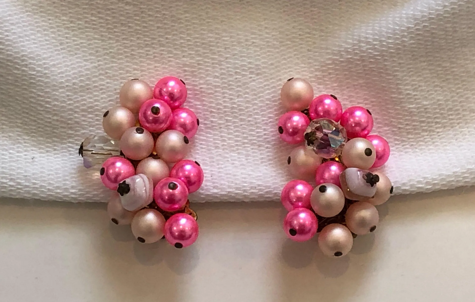 AMAZING VINTAGE BEAD CLUSTER CLIP ON EARRINGS SIGNED "JAPAN" ASSORTED SHAPES & SHADES OF PINK THEY M... Show more