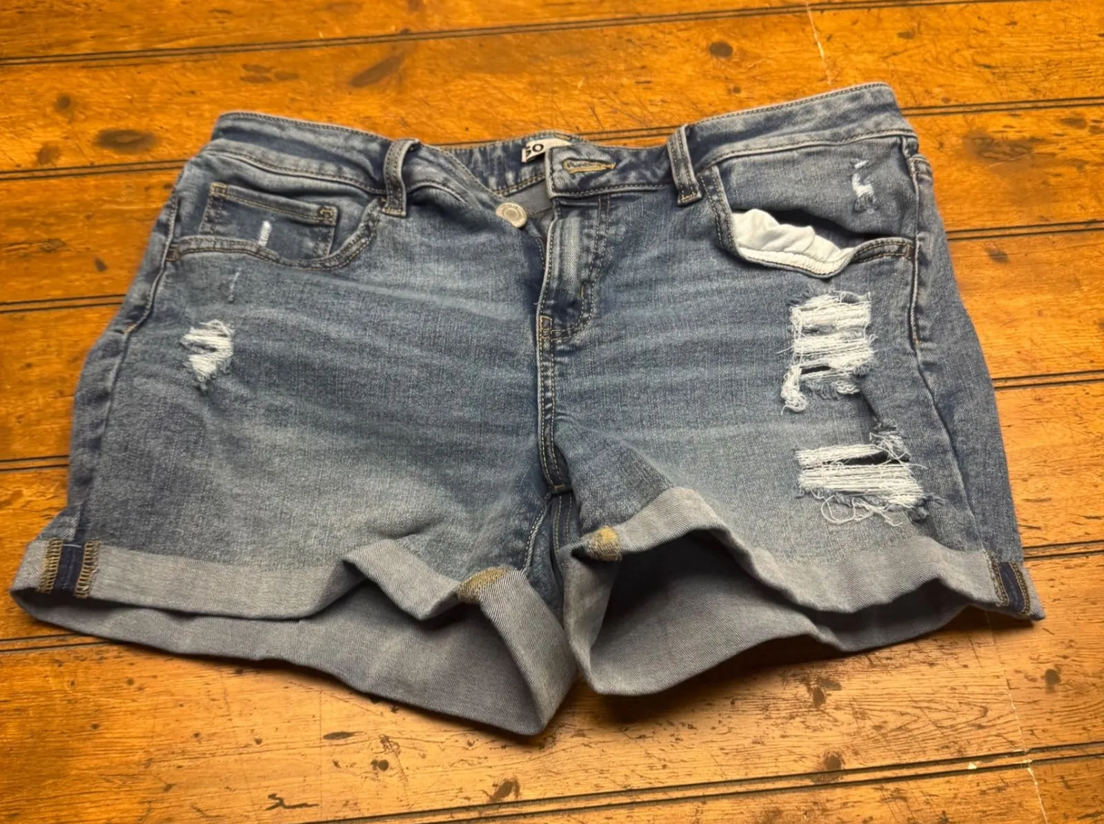 SO Goods for Life low rise midi denim shorts in a medium wash. These shorts feature a cuffed hem and distressed detailing for a casual, lived-in look. Perfect for everyday wear or a relaxed weekend Keywords: SO Jeans, denim shorts, distressed, cuffed hem, low rise, midi shorts, summer shorts, casual wear, everyday shorts, plus size, curvy fit, festival wear