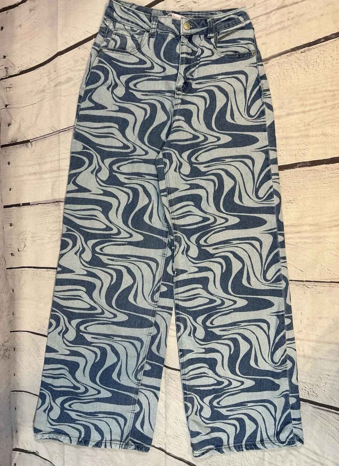 Swirl print blue denim wide leg high rise jeans by SO Good For Life in size 9/29W. Soft and comforta... Show more