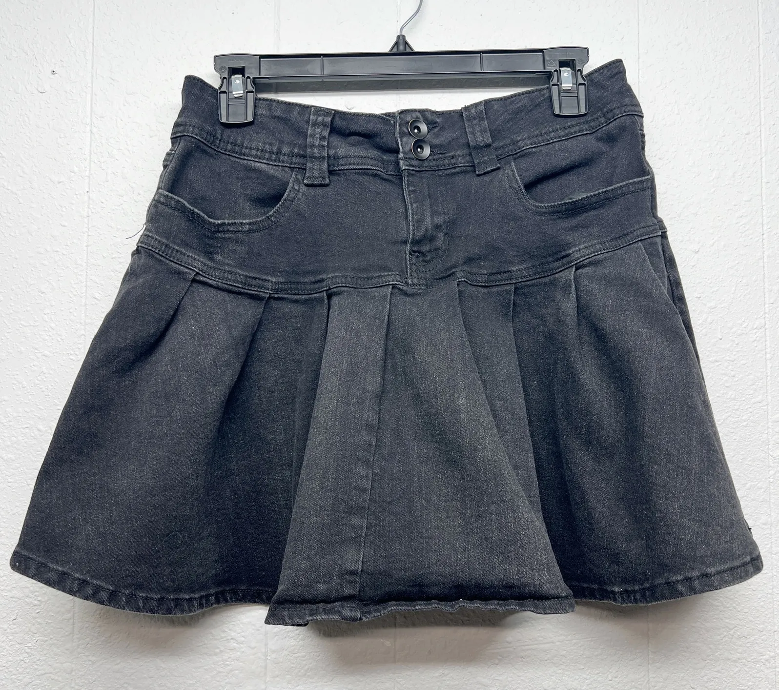 Social Collision women's denim flared mini skirt. Double metal button & zipper closure. Wide belt loops. Side pockets. Stonewash black. In good used condition. No stains, tears or holes. Cotton, polyester, spandex blend. Machine wash.