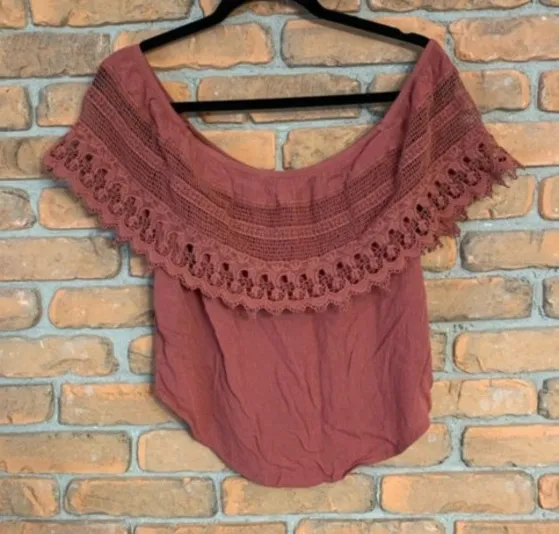 Charming off-the-shoulder blouse featuring a delicate lace trim. This top showcases a wide neckline... Show more
