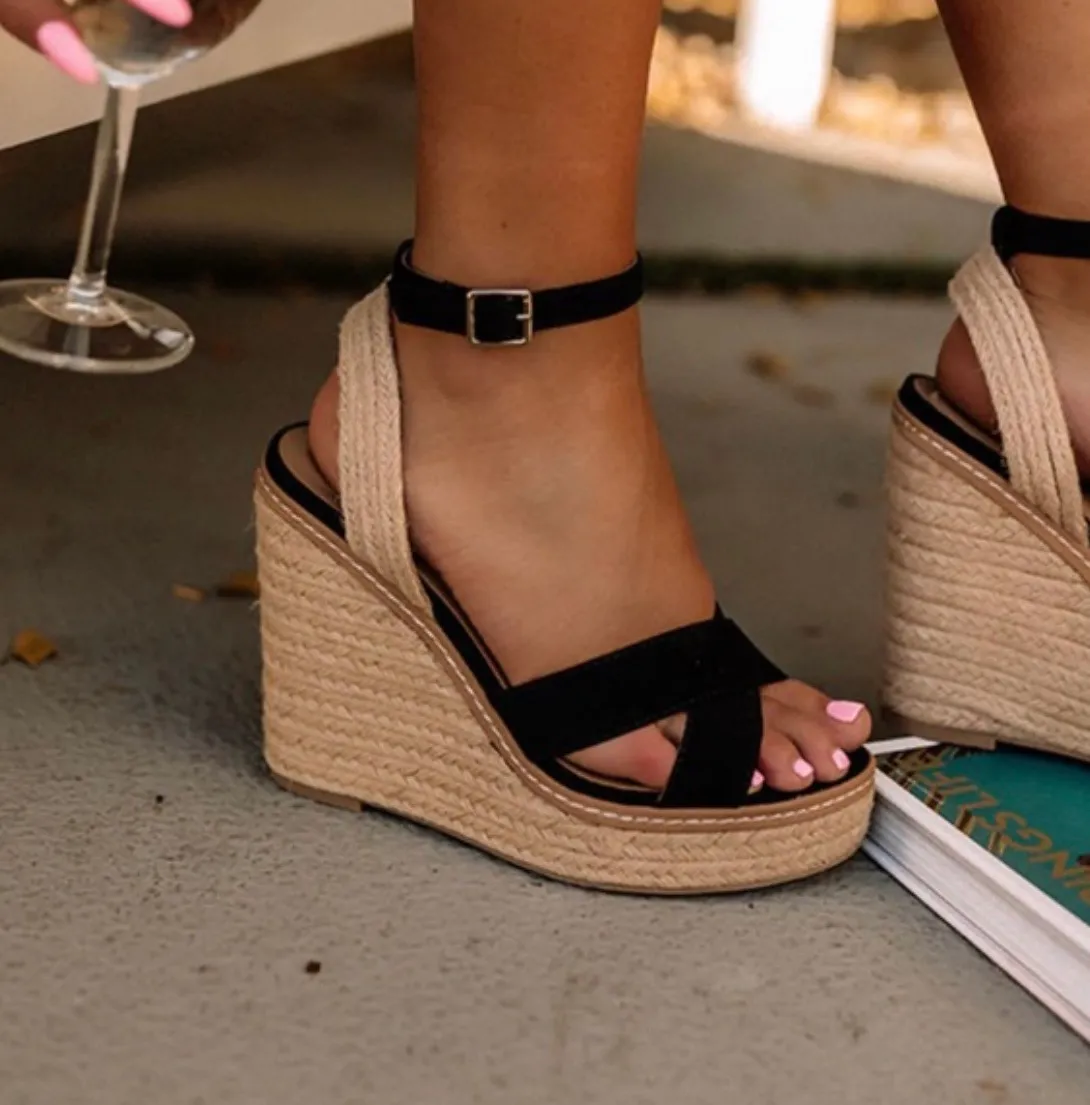 Walk into the warmer months in style with these adorable black 'Espadrille featuring two crossed over-the-foot straps, a rounded open toe, a 3.5-inch wedged heel, and an open heel with a buckled ankle strap! This wedge runs more true to size. Made by soda, just never wore them