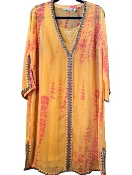 Soft Surroundings 2Pcs Sheer overdress and soft stretchy Cami dress M Silver Beeding Split 3/4 Sleeve Tangerine and Pink Vacation Resort Cruise Tropical No Flaws or Signs of wear