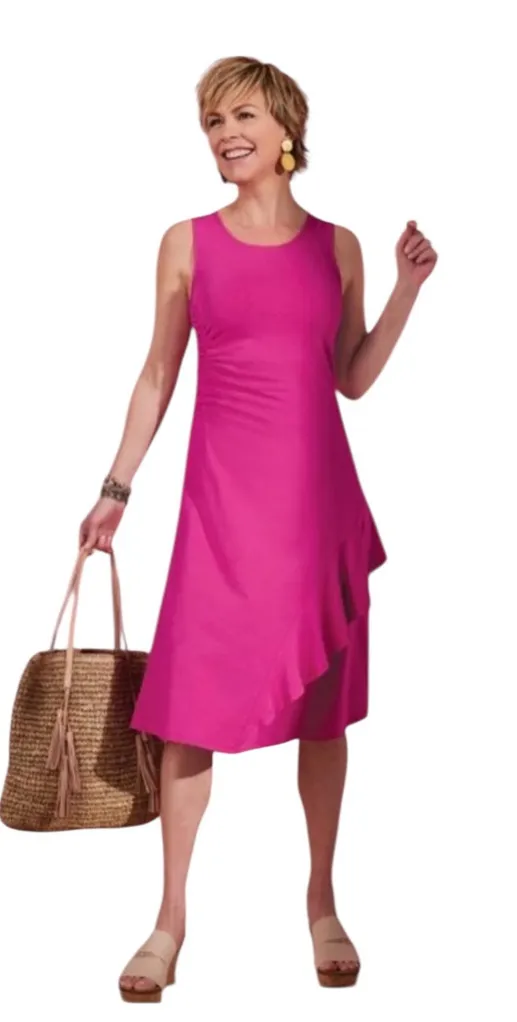 . Excellent condition no issues. Pink cactus color tank dress with ruched side detail and ruffle on the other side. See photos for flat lay measurements. Tags: summer vacation travel midi sleeveless ruffle stretch