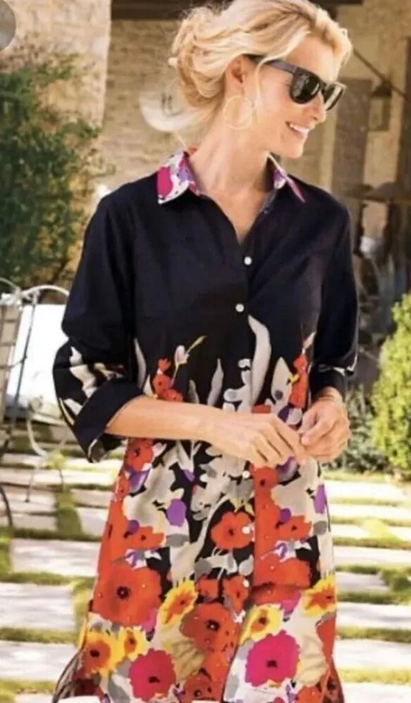 Soft Surroundings Black Bohemian Floral Embellished Cotton Button Down Shirt Dress SZ PL #2424 Preow... Show more